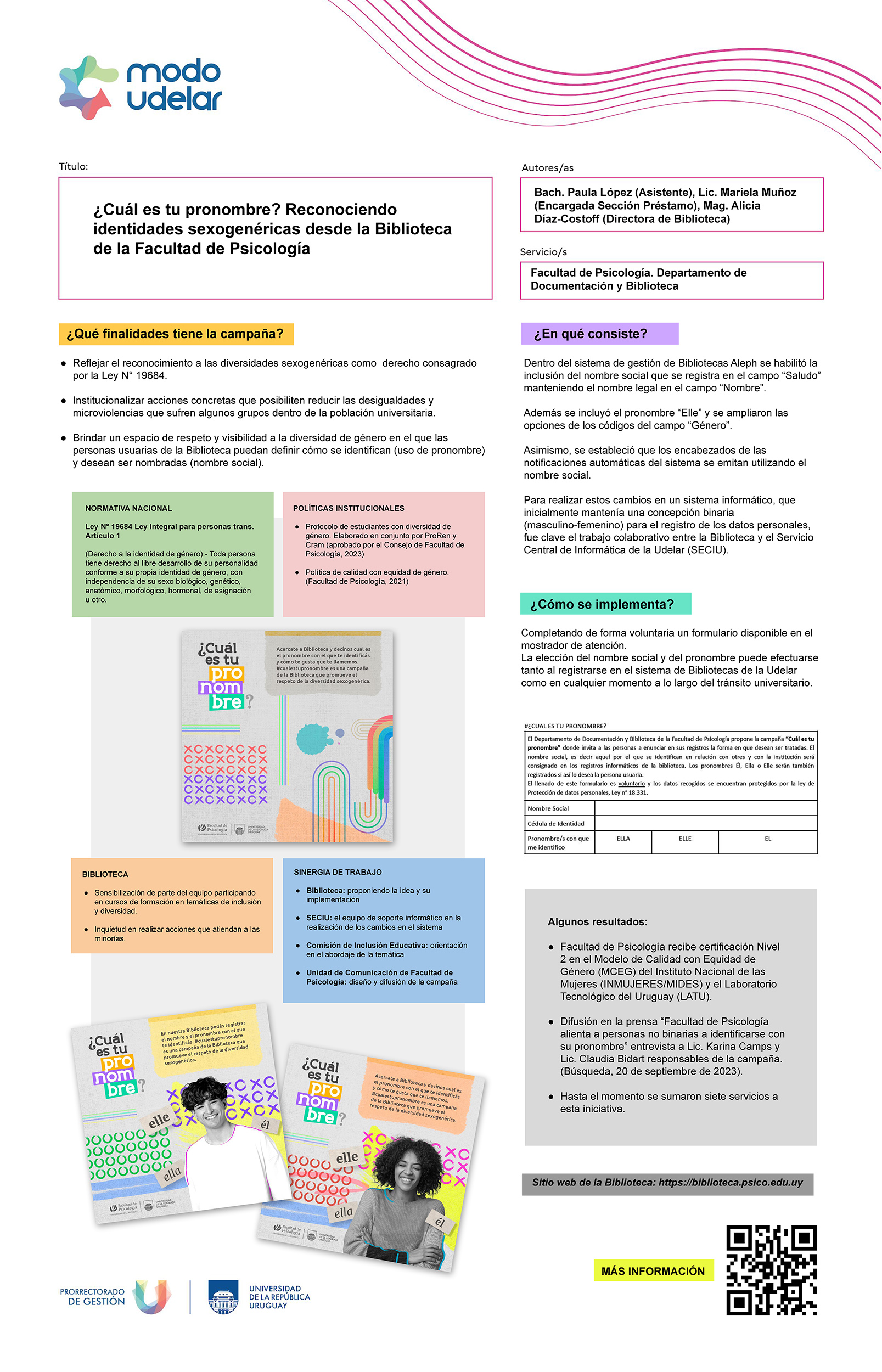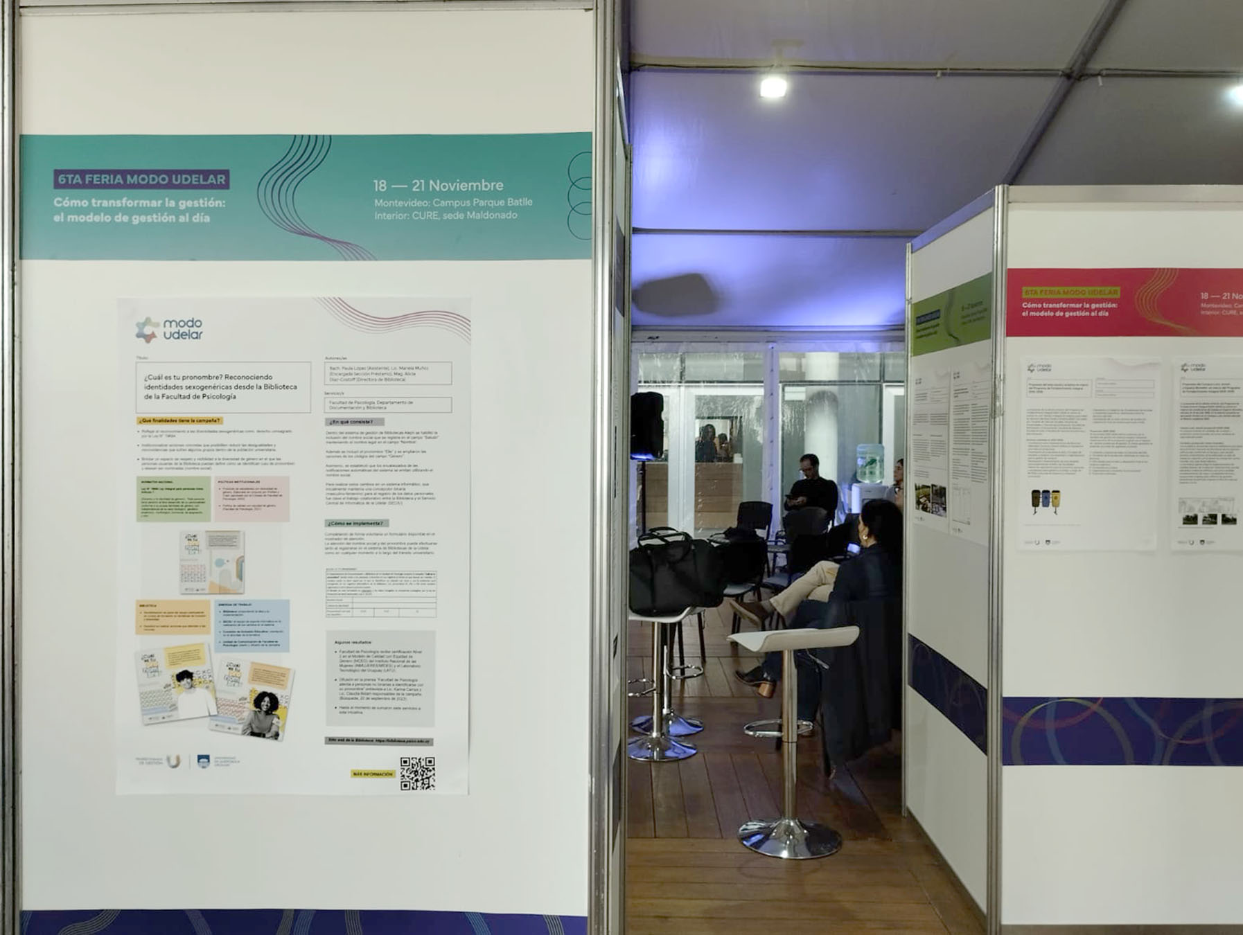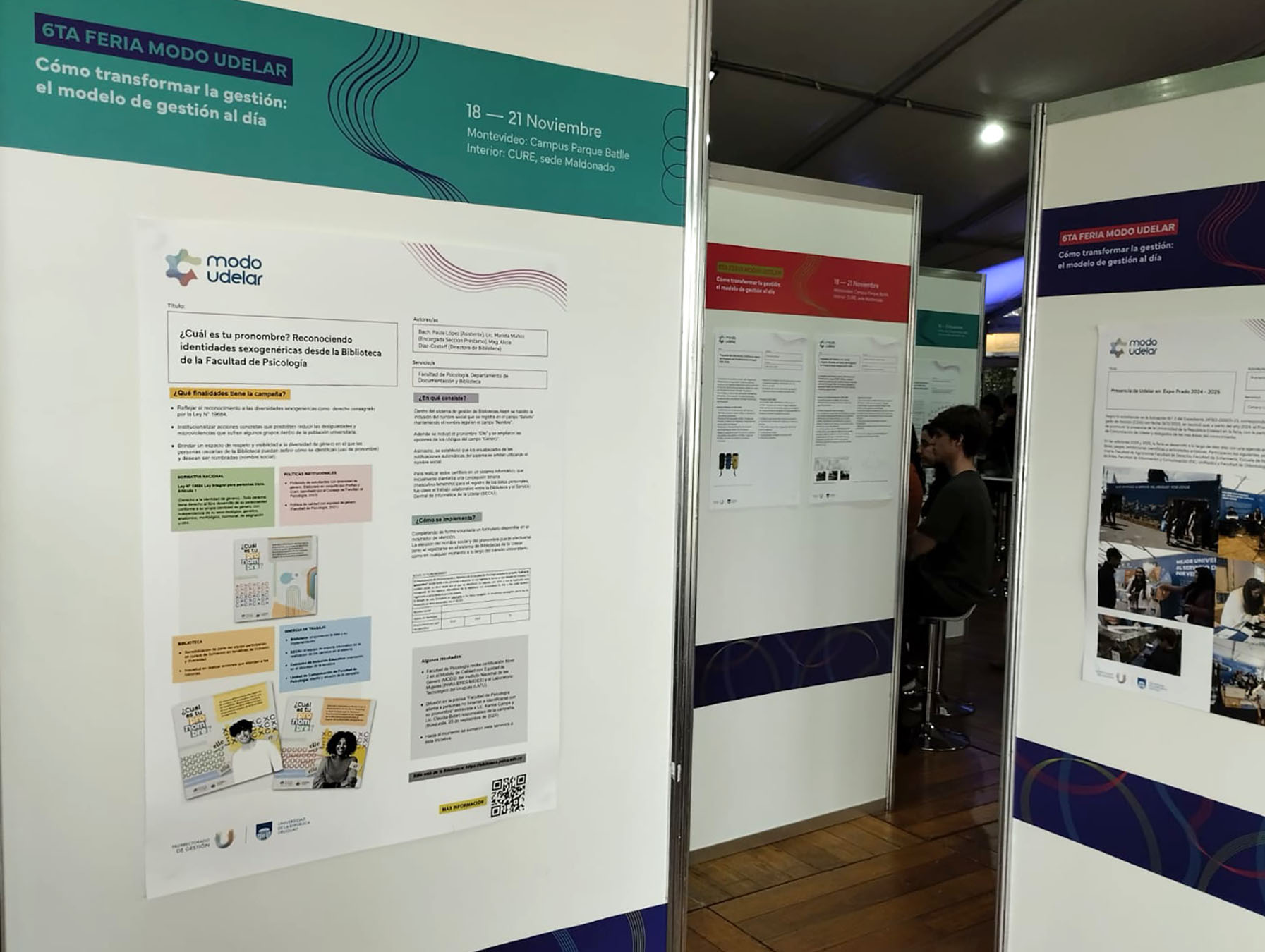 El Departamento de Documentación y Biblioteca de la Facultad de Psicología participó en la VI edición de la Feria Modo Udelar, realizada los días 18, 20 y 21 de noviembre en las sedes de Maldonado del Centro Universitario Regional del Este (CURE) y en el Campus Parque Batlle de Montevideo. En esta oportunidad, el equipo presentó el póster “¿Cuál es tu pronombre? Reconociendo identidades sexogenéricas desde la Biblioteca de la Facultad de Psicología”, una propuesta orientada a promover prácticas de reconocimiento, respeto e inclusión dentro del ámbito universitario.